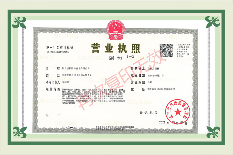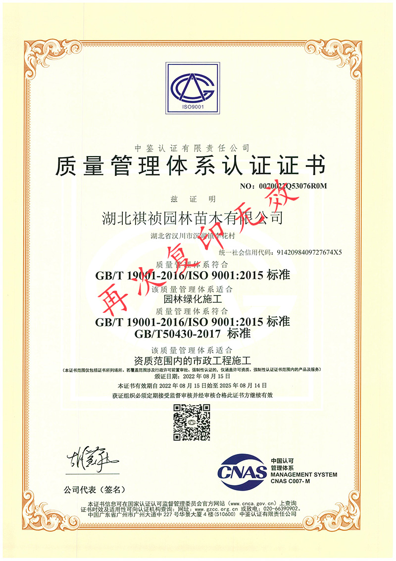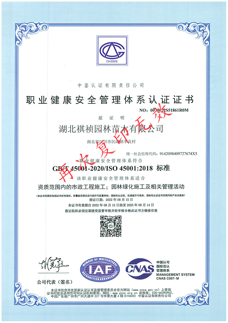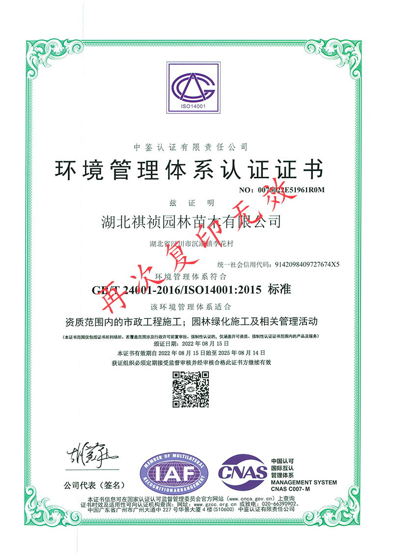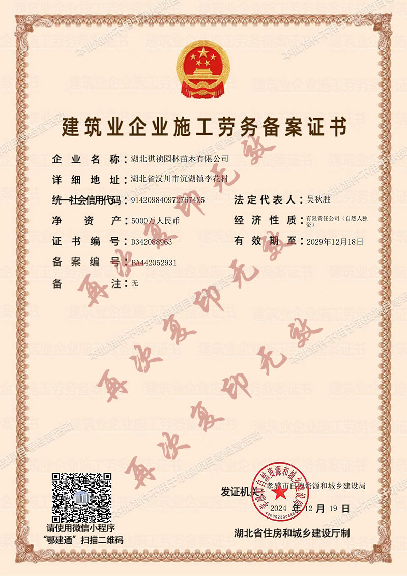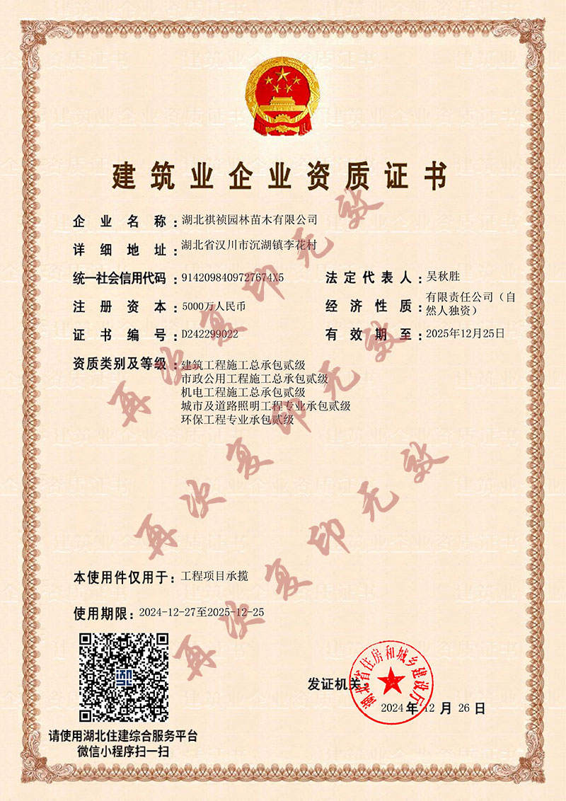 湖北祺禎園林苗木有限公司是一家專門致力于發(fā)展現(xiàn)代林業(yè)、苗圃花卉、旅游觀光、休閑娛樂、園林市政環(huán)保工程建設(shè)于一體的湖北省林業(yè)產(chǎn)業(yè)化省級龍頭企業(yè),公司具備城市園林綠化、建筑工程施工總承包、市政公用工程施工總承包、機電工程施工總承包、城市及道路照明工程專業(yè)承包、環(huán)保工程專業(yè)承包、施工勞務(wù)資質(zhì)不分等級等多項建筑業(yè)企業(yè)資質(zhì),先后獲得湖北省林業(yè)產(chǎn)業(yè)化省級重點龍頭企業(yè)、AAA級信用等級企業(yè)、孝感市“守合同重信用榮譽證書”、“五一勞動獎”等榮譽及質(zhì)量管理、環(huán)境管理、職業(yè)健康安全管理三大體系認證。